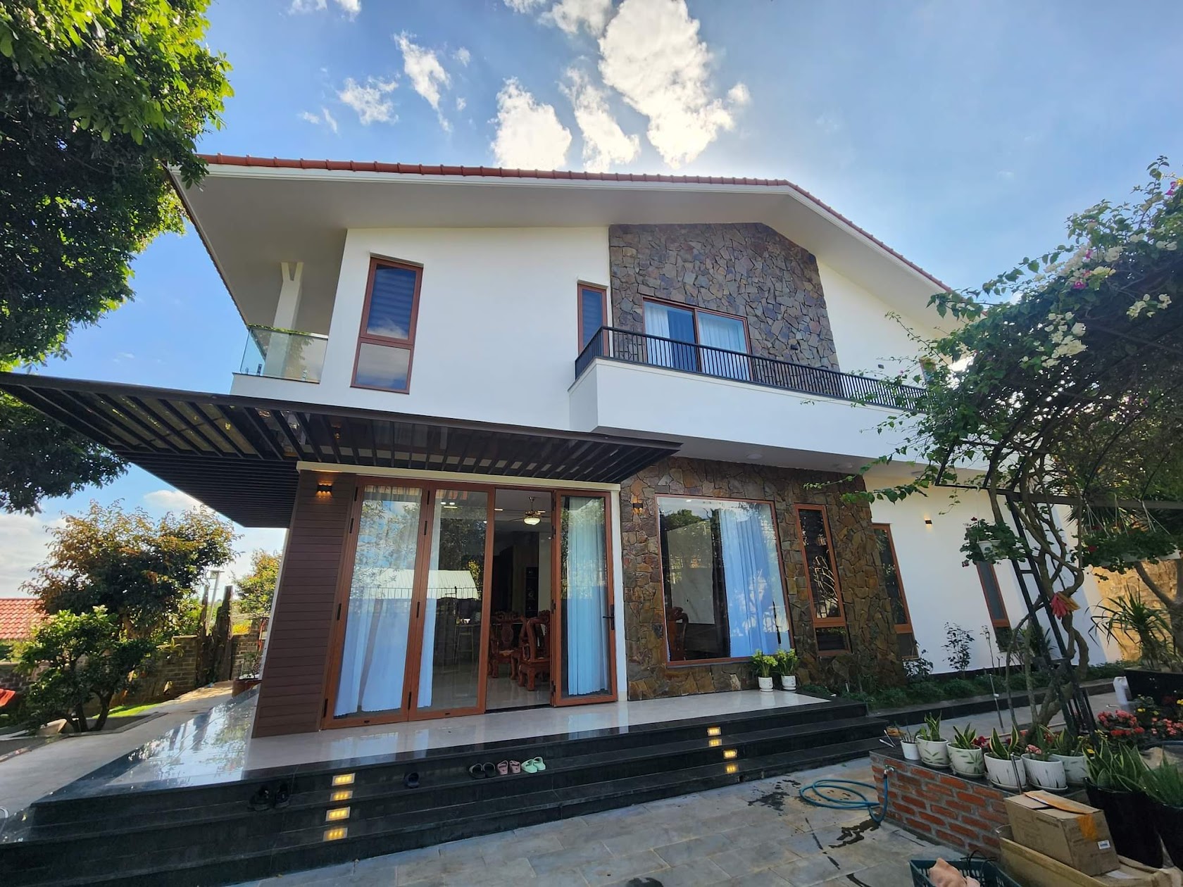 - Hệ lam chắn nắng: Vừa là điểm nhấn thẩm mỹ biệt thự phố, vừa “tán” nhiệt lượng trước khi chạm vào lớp kính, giúp không gian nội thất luôn mát mẻ mà không cần lạm dụng máy lạnh.